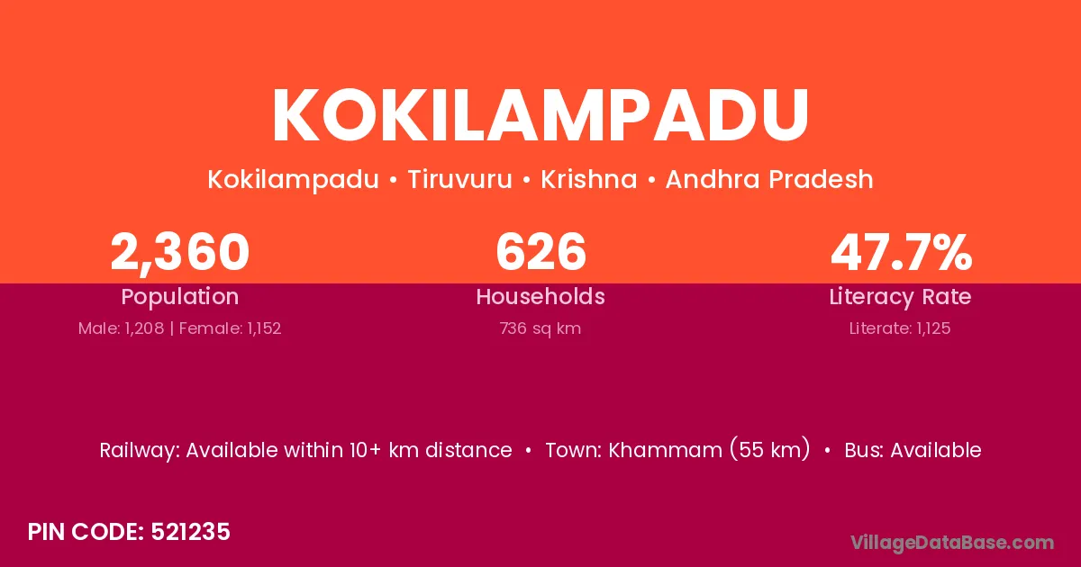 Khammam (55 km) is the nearest town to Kokilampadu village for major economic activities and is located approximately 55 km away.