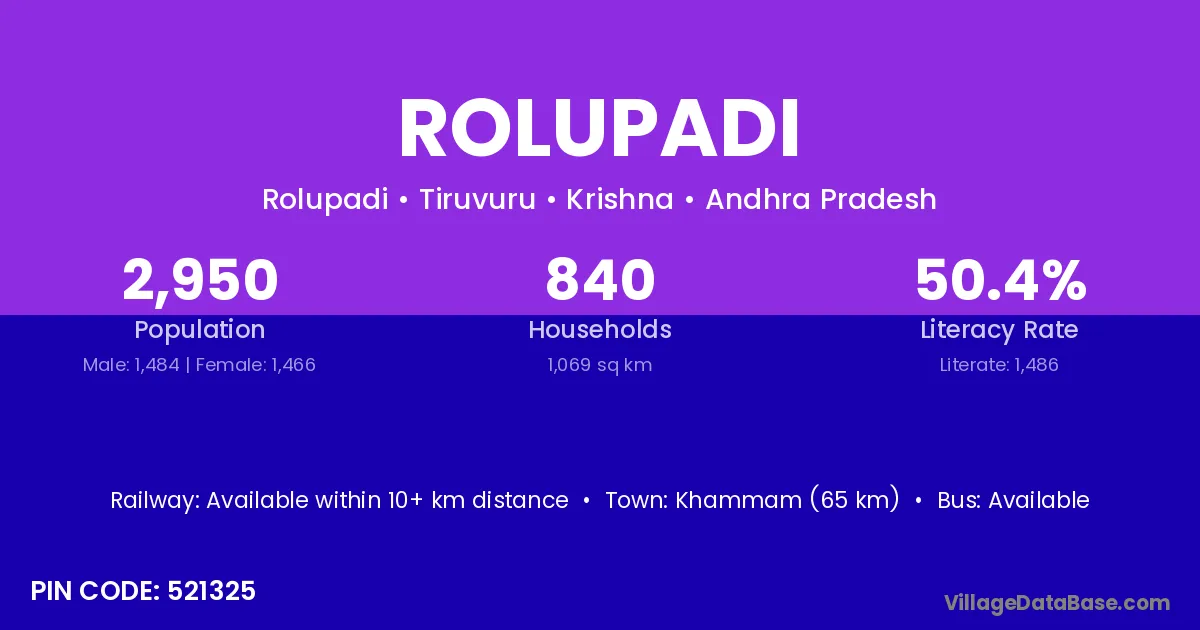 Khammam (65 km) is the nearest town to Rolupadi village for major economic activities and is located approximately 65 km away.