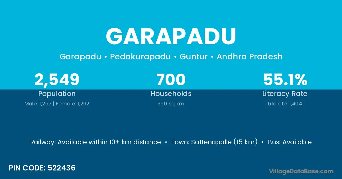 Gudivada (22 km) is the nearest town to Garapadu village for major economic activities and is located approximately 22 km away.
