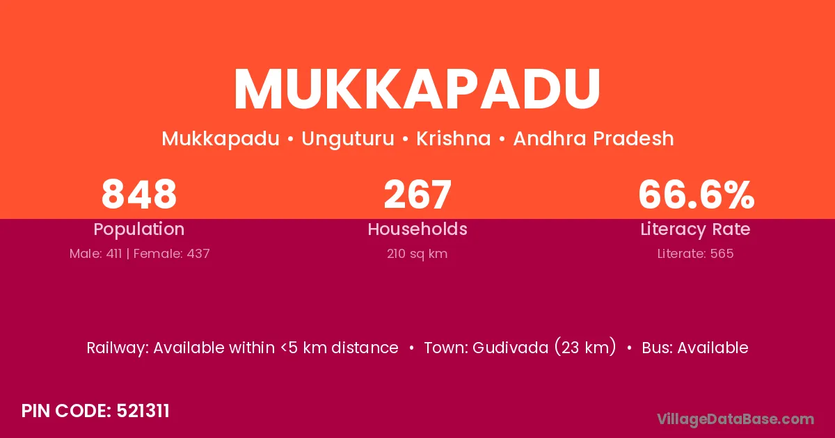 Gudivada (23 km) is the nearest town to Mukkapadu village for major economic activities and is located approximately 23 km away.