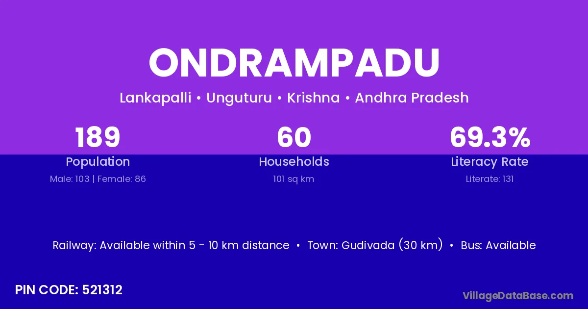 Gudivada (30 km) is the nearest town to Ondrampadu village for major economic activities and is located approximately 30 km away.