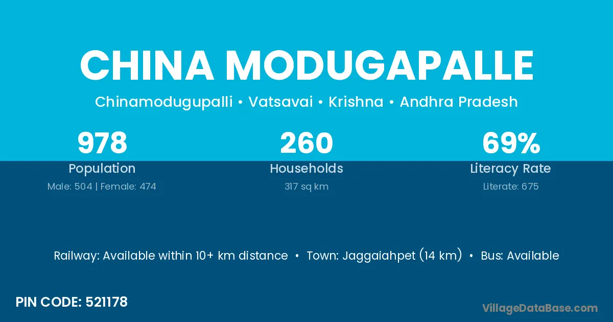 Jaggaiahpet (14 km) is the nearest town to China Modugapalle village for major economic activities and is located approximately 14 km away.