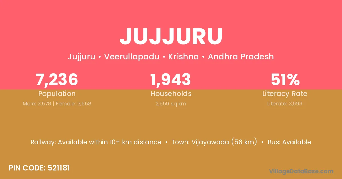 Vijayawada (56 km) is the nearest town to Jujjuru village for major economic activities and is located approximately 56 km away.