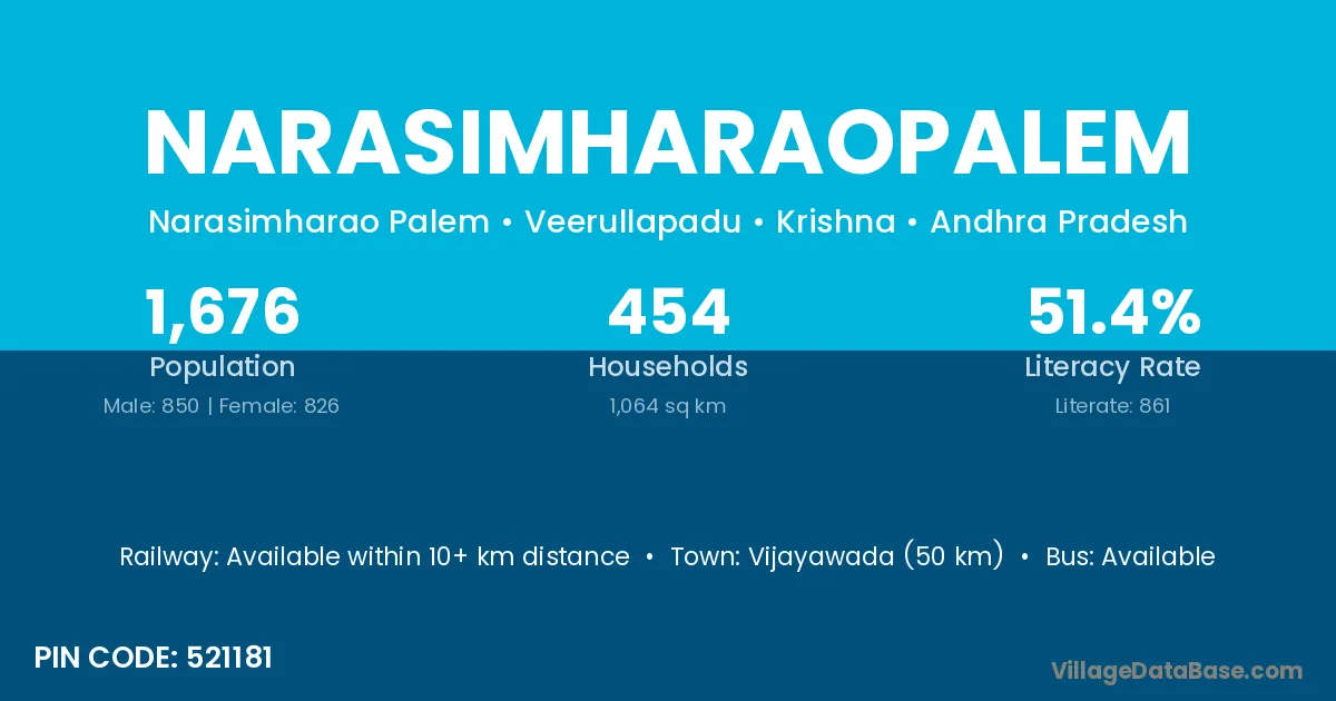 Vijayawada (50 km) is the nearest town to Narasimharaopalem village for major economic activities and is located approximately 50 km away.