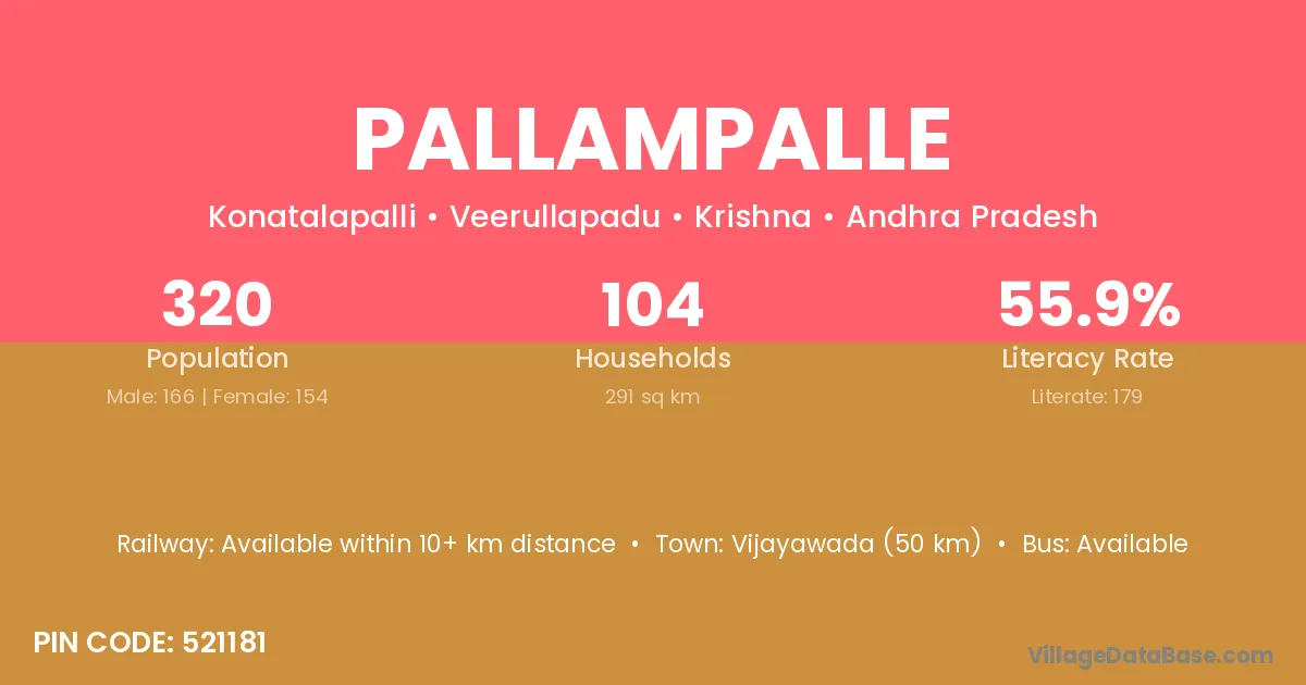 Vijayawada (50 km) is the nearest town to Pallampalle village for major economic activities and is located approximately 50 km away.