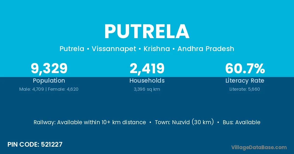 Nuzvid (30 km) is the nearest town to Putrela village for major economic activities and is located approximately 30 km away.