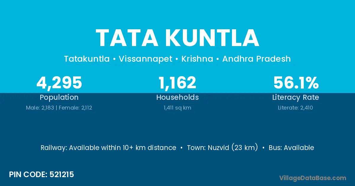 Tata Kuntla village has a total population of 4,295 people, of which 2,183 are males and 2,112 are females.