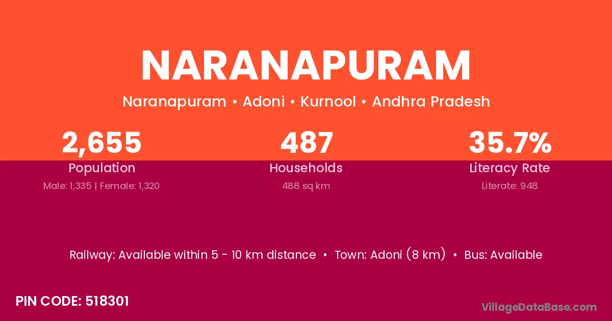 Adoni (8 km) is the nearest town to Naranapuram village for major economic activities and is located approximately 8 km away.
