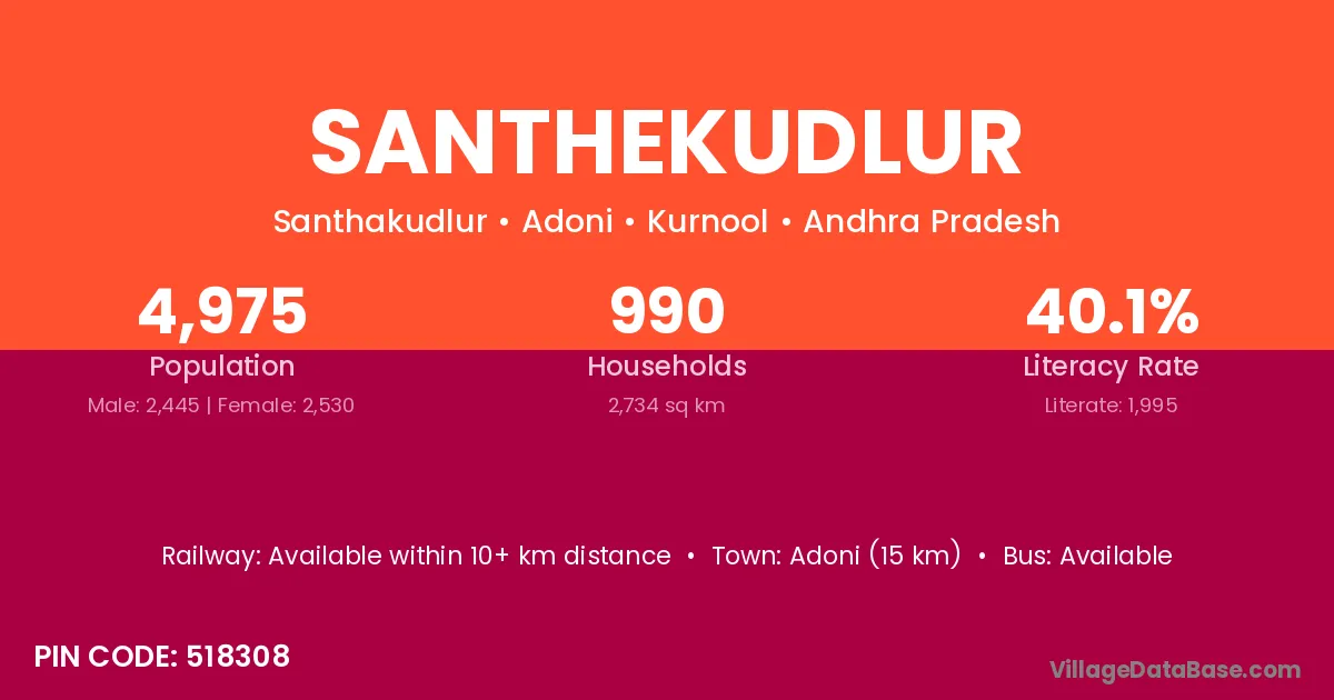 Adoni (15 km) is the nearest town to Santhekudlur village for major economic activities and is located approximately 15 km away.