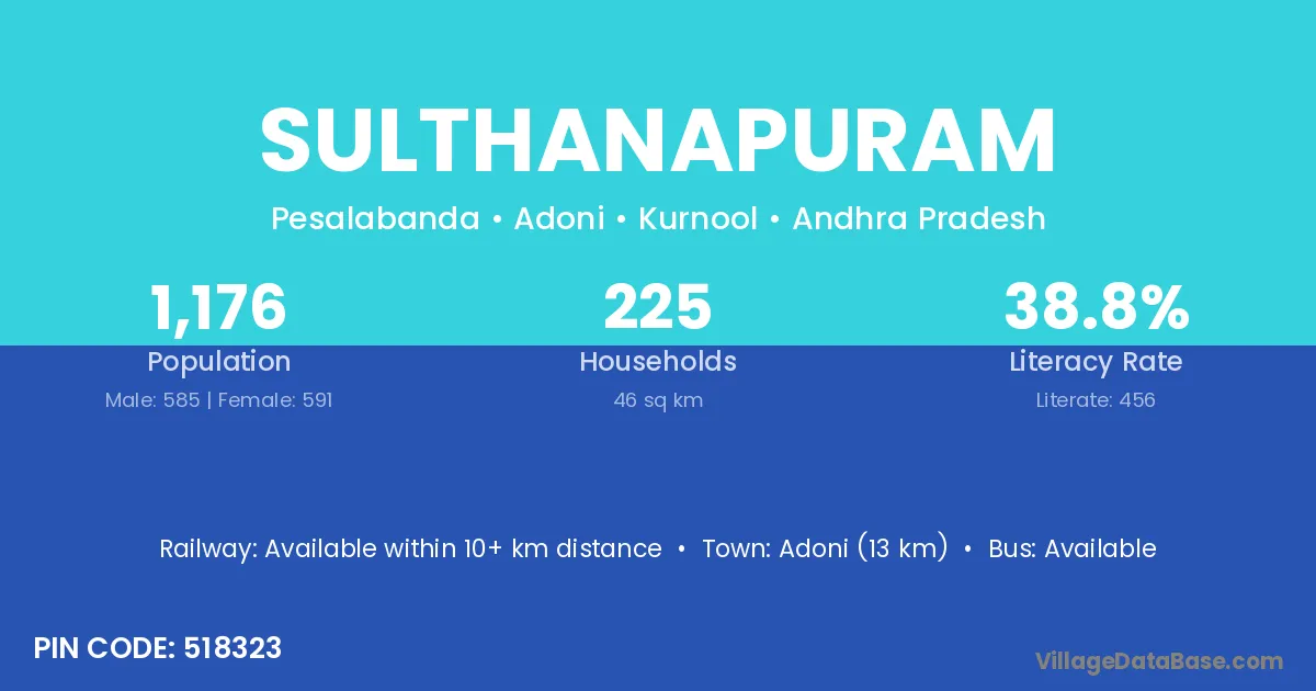Adoni (13 km) is the nearest town to Sulthanapuram village for major economic activities and is located approximately 13 km away.
