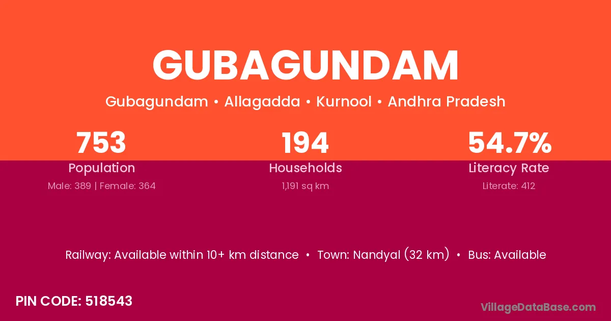 Nandyal (32 km) is the nearest town to Gubagundam village for major economic activities and is located approximately 32 km away.