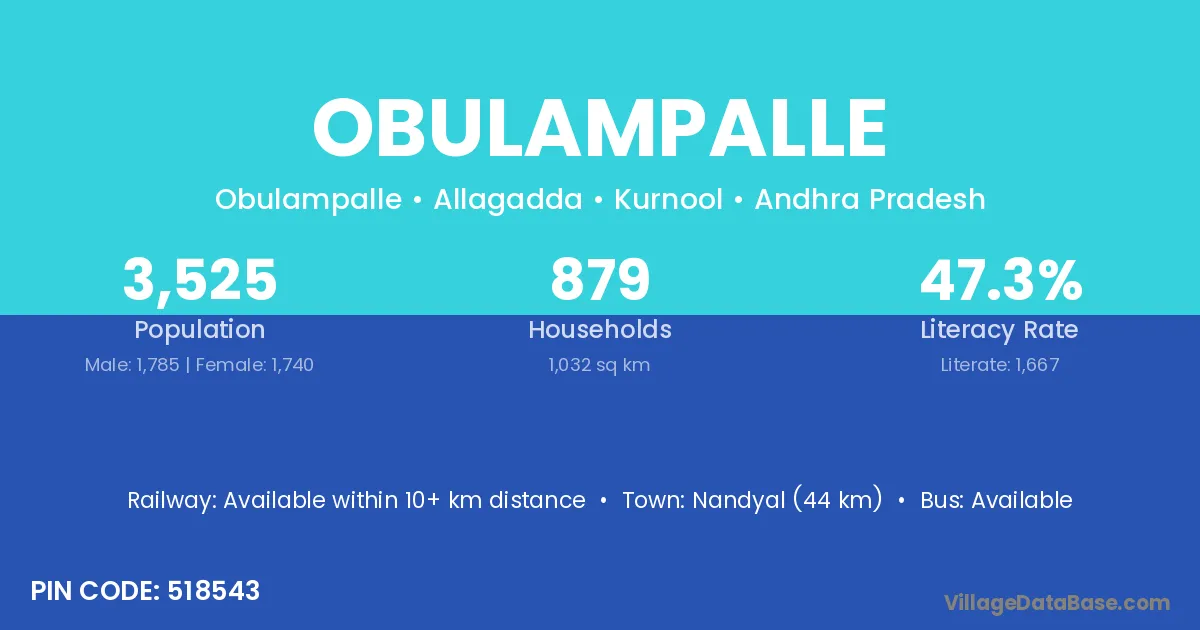 Nandyal (44 km) is the nearest town to Obulampalle village for major economic activities and is located approximately 44 km away.
