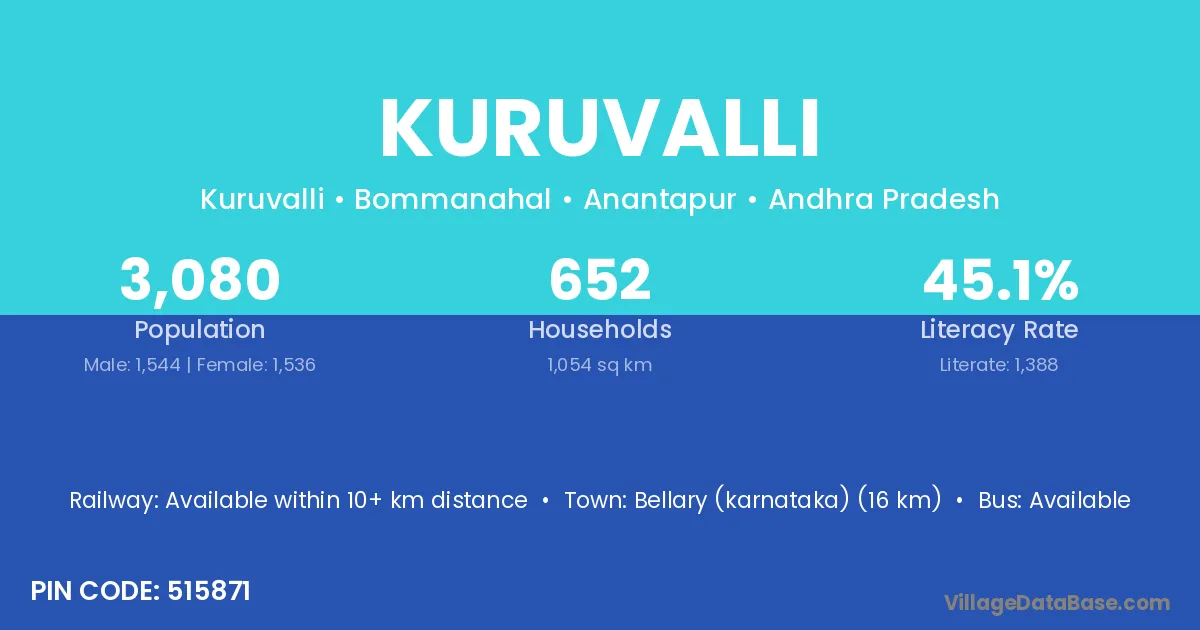 Adoni (25 km) is the nearest town to Kuruvalli village for major economic activities and is located approximately 25 km away.