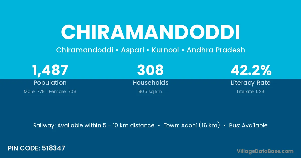 Adoni (16 km) is the nearest town to Chiramandoddi village for major economic activities and is located approximately 16 km away.