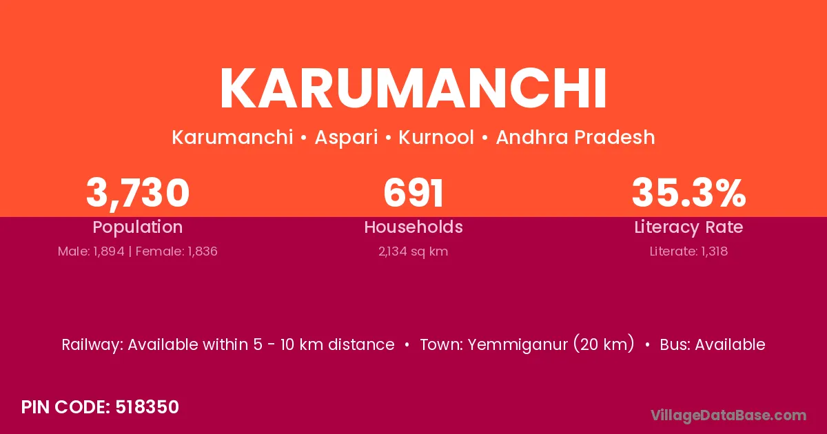 Yemmiganur (20 km) is the nearest town to Karumanchi village for major economic activities and is located approximately 20 km away.