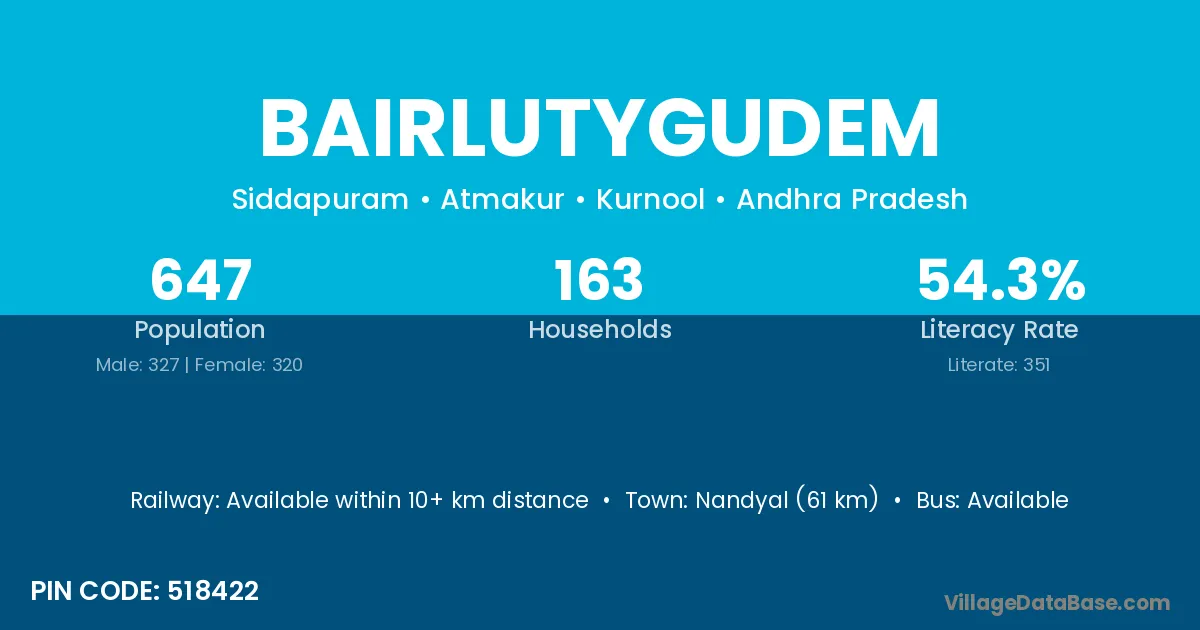 Nandyal (61 km) is the nearest town to Bairlutygudem village for major economic activities and is located approximately 61 km away.