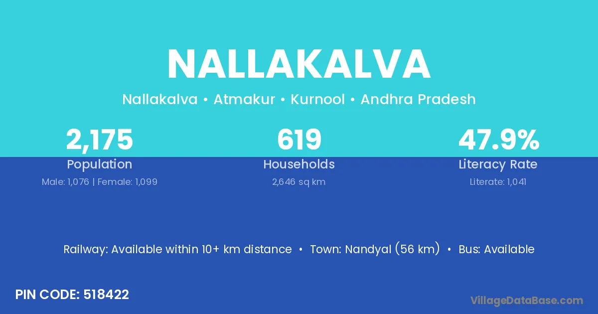 Nandyal (56 km) is the nearest town to Nallakalva village for major economic activities and is located approximately 56 km away.