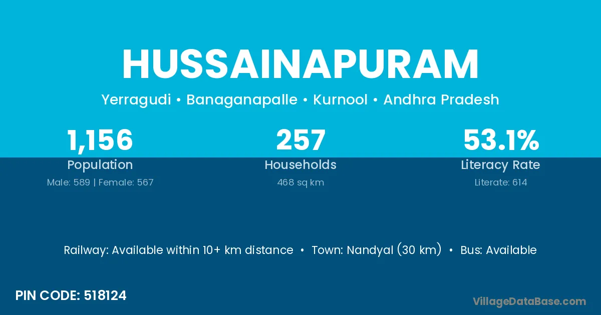 Nandyal (30 km) is the nearest town to Hussainapuram village for major economic activities and is located approximately 30 km away.