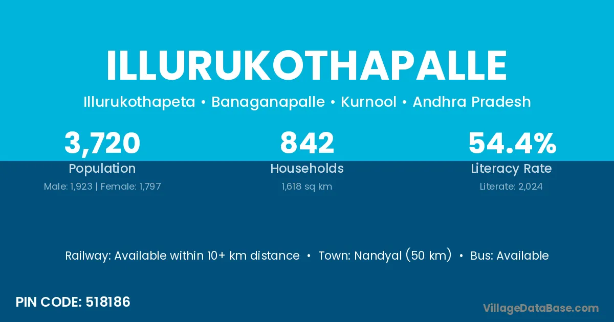 Illurukothapalle village has a total population of 3,720 people, of which 1,923 are males and 1,797 are females.