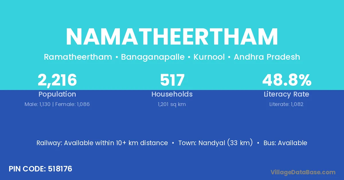Namatheertham village has a total population of 2,216 people, of which 1,130 are males and 1,086 are females.