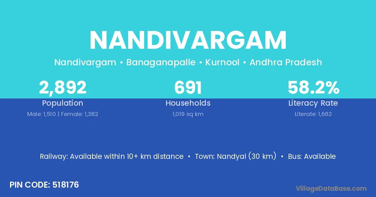 Nandyal (30 km) is the nearest town to Nandivargam village for major economic activities and is located approximately 30 km away.