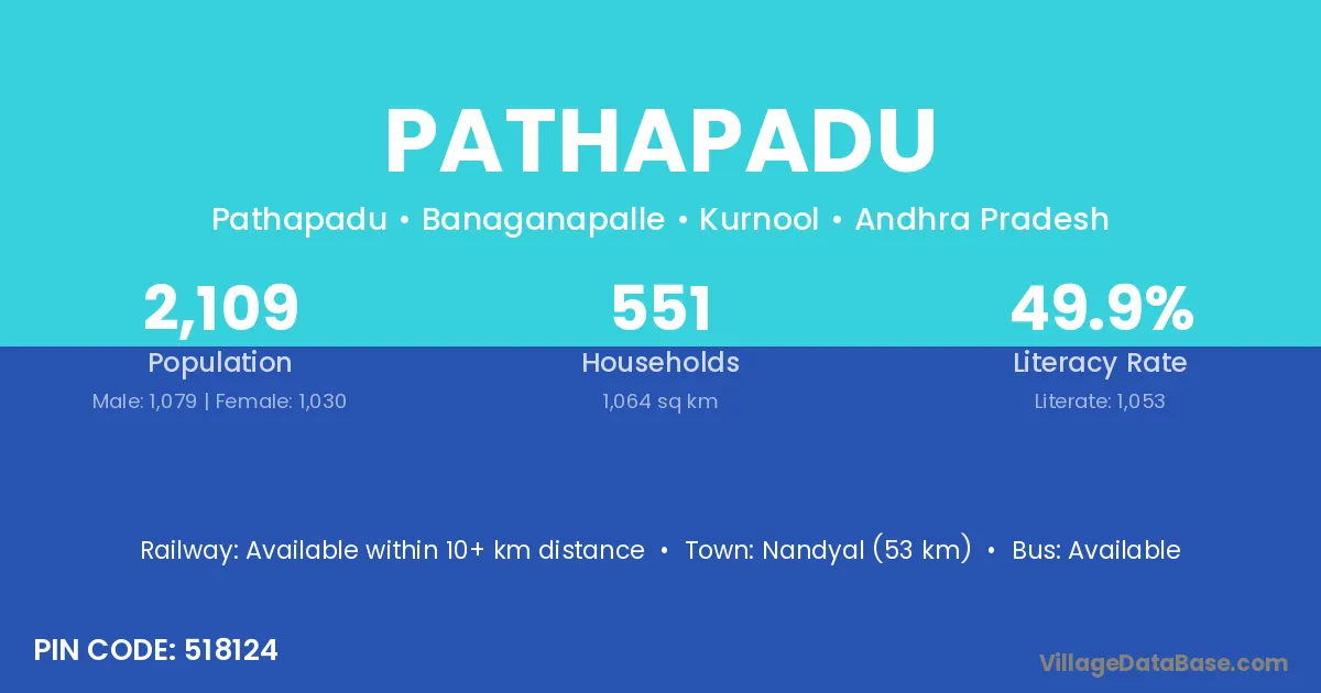 Nandyal (53 km) is the nearest town to Pathapadu village for major economic activities and is located approximately 53 km away.