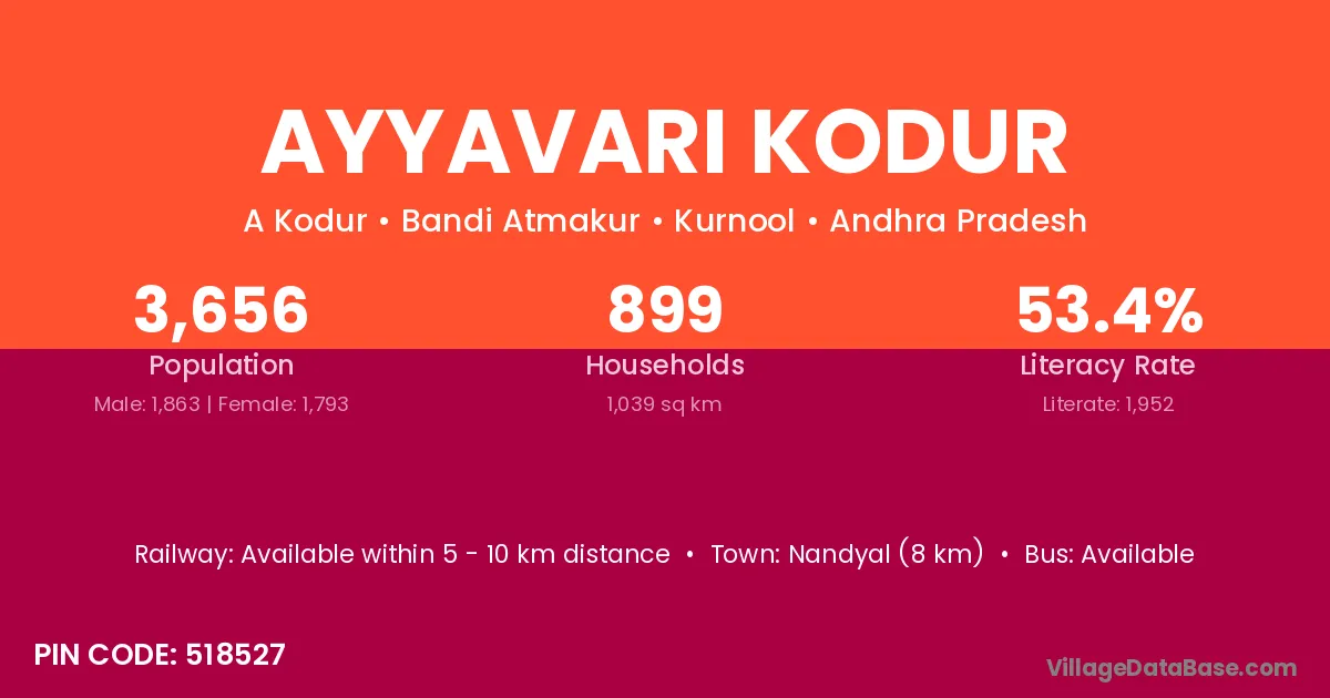 Nandyal (8 km) is the nearest town to Ayyavari Kodur village for major economic activities and is located approximately 8 km away.