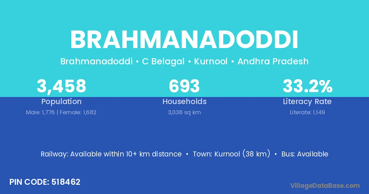 Kurnool (38 km) is the nearest town to Brahmanadoddi village for major economic activities and is located approximately 38 km away.