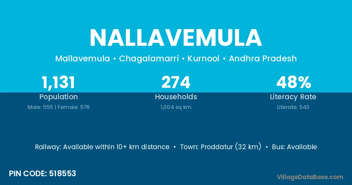 Proddatur (32 km) is the nearest town to Nallavemula village for major economic activities and is located approximately 32 km away.
