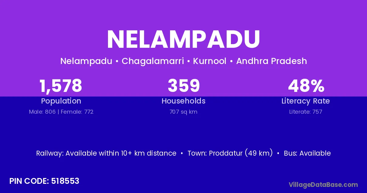 Proddatur (49 km) is the nearest town to Nelampadu village for major economic activities and is located approximately 49 km away.