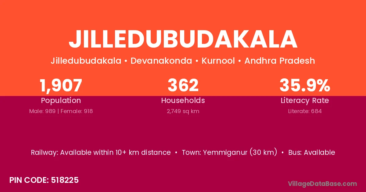 Jilledubudakala village has a total population of 1,907 people, of which 989 are males and 918 are females.