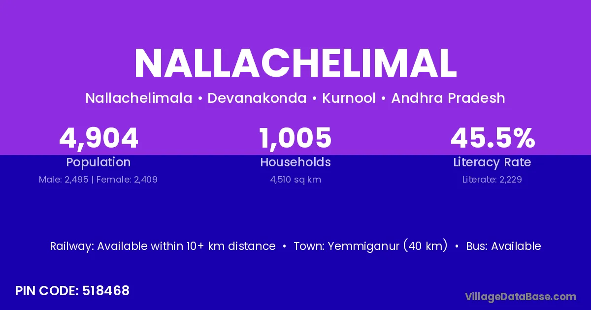 Yemmiganur (40 km) is the nearest town to Nallachelimal village for major economic activities and is located approximately 40 km away.