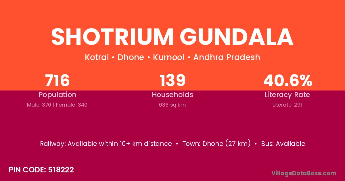 Dhone (27 km) is the nearest town to Shotrium Gundala village for major economic activities and is located approximately 27 km away.