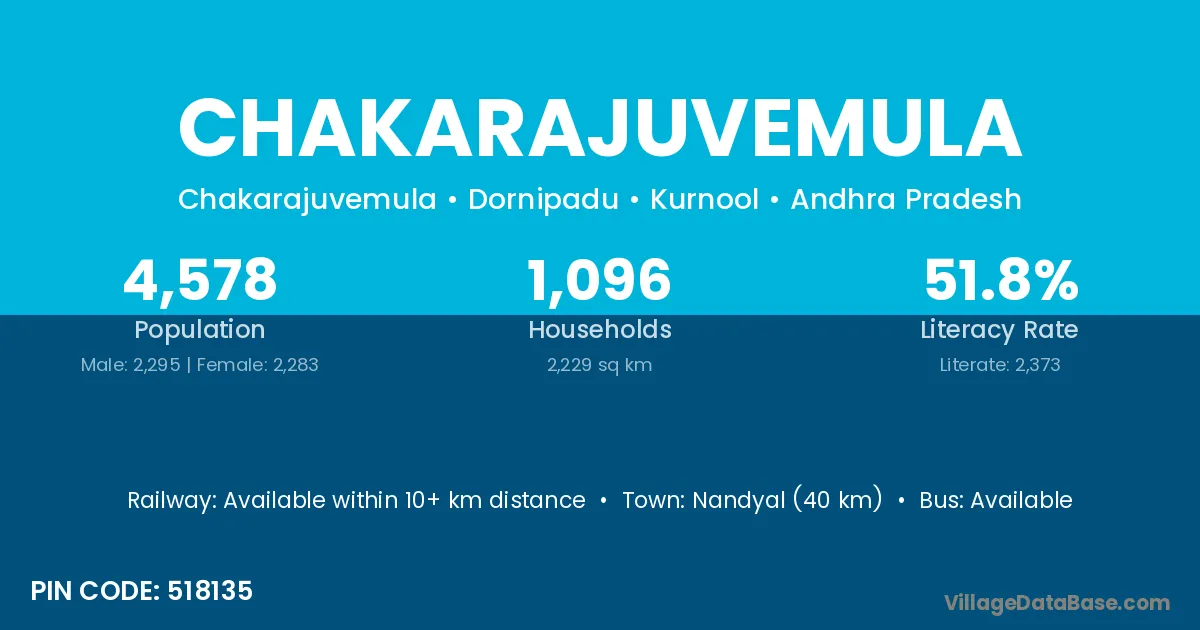 Nandyal (40 km) is the nearest town to Chakarajuvemula village for major economic activities and is located approximately 40 km away.