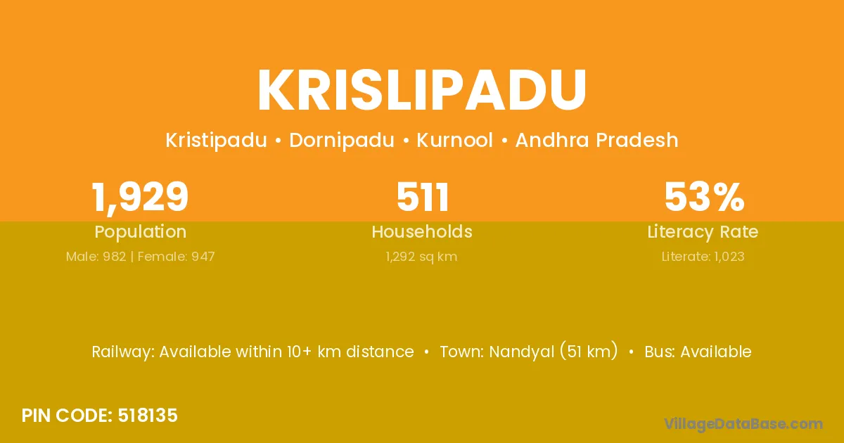 Nandyal (51 km) is the nearest town to Krislipadu village for major economic activities and is located approximately 51 km away.
