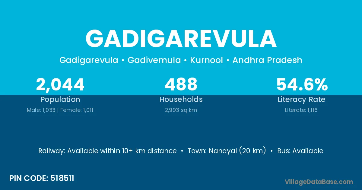 Nandyal (20 km) is the nearest town to Gadigarevula village for major economic activities and is located approximately 20 km away.
