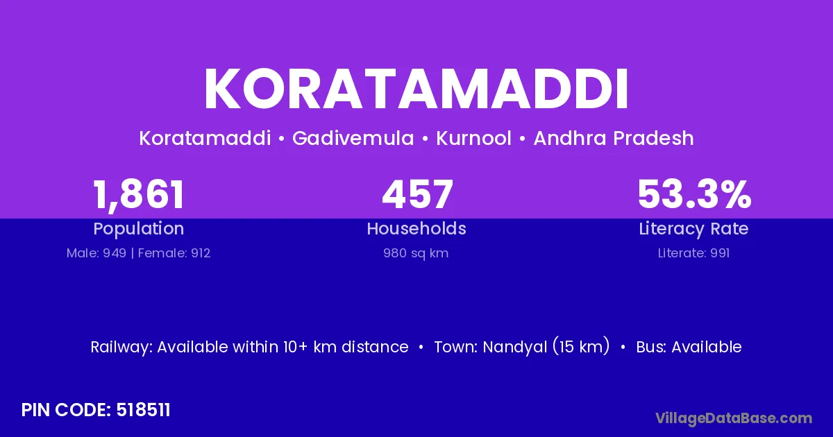 Koratamaddi village has a total population of 1,861 people, of which 949 are males and 912 are females.