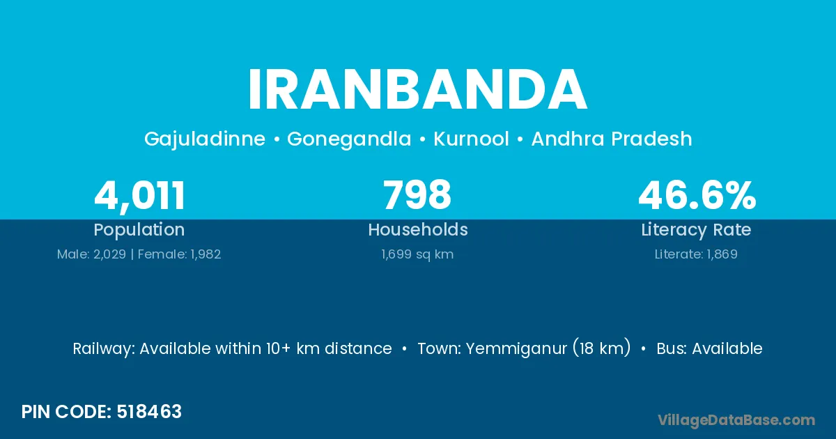 Yemmiganur (18 km) is the nearest town to Iranbanda village for major economic activities and is located approximately 18 km away.