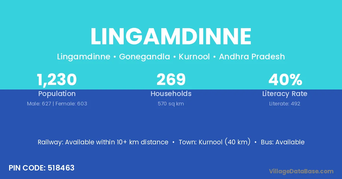 Kurnool (40 km) is the nearest town to Lingamdinne village for major economic activities and is located approximately 40 km away.
