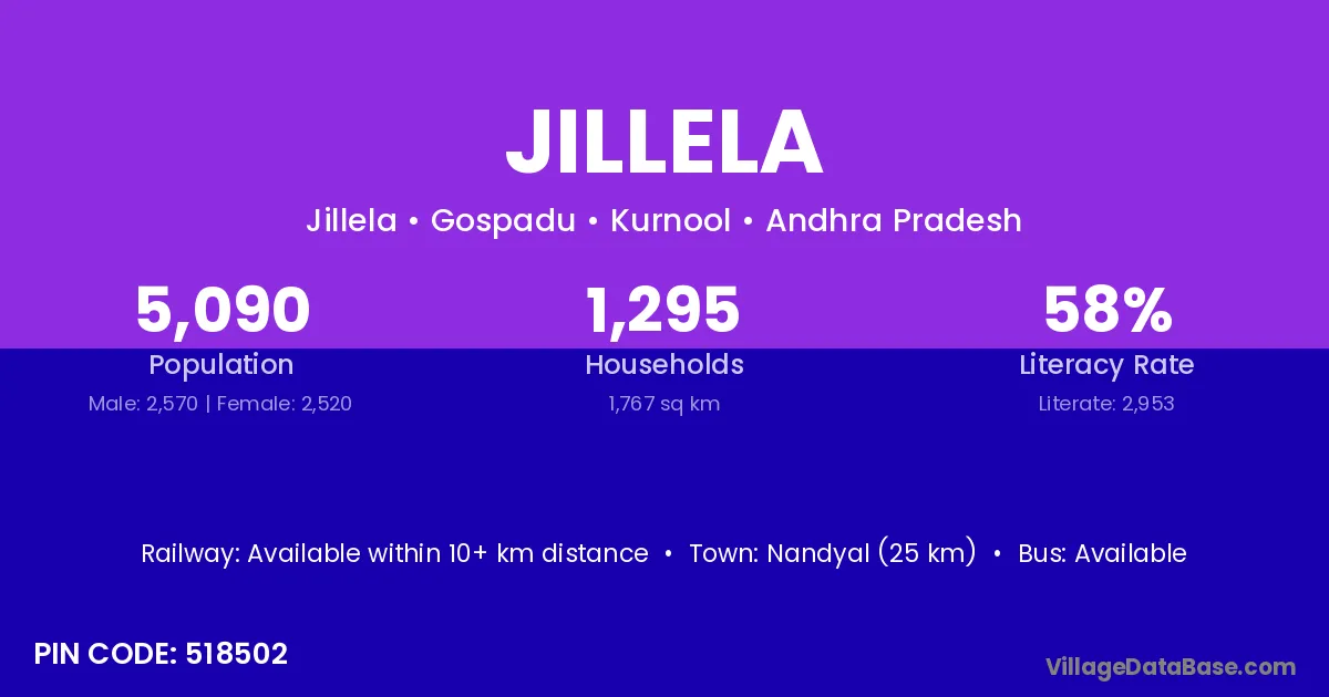 Nandyal (25 km) is the nearest town to Jillela village for major economic activities and is located approximately 25 km away.