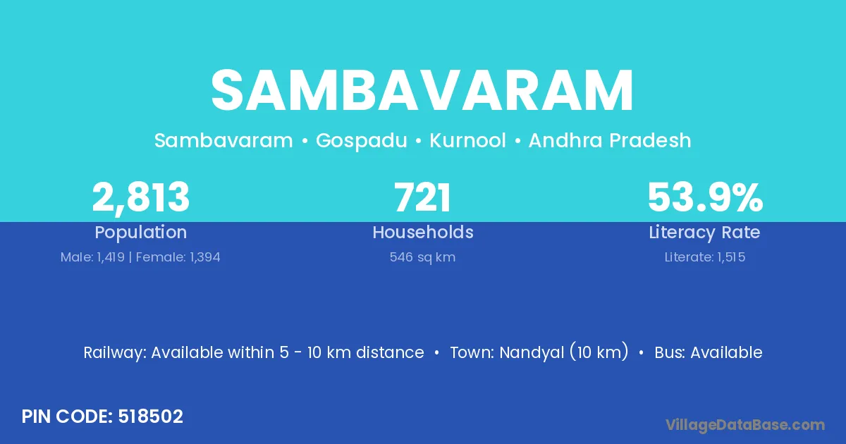 Nandyal (10 km) is the nearest town to Sambavaram village for major economic activities and is located approximately 10 km away.