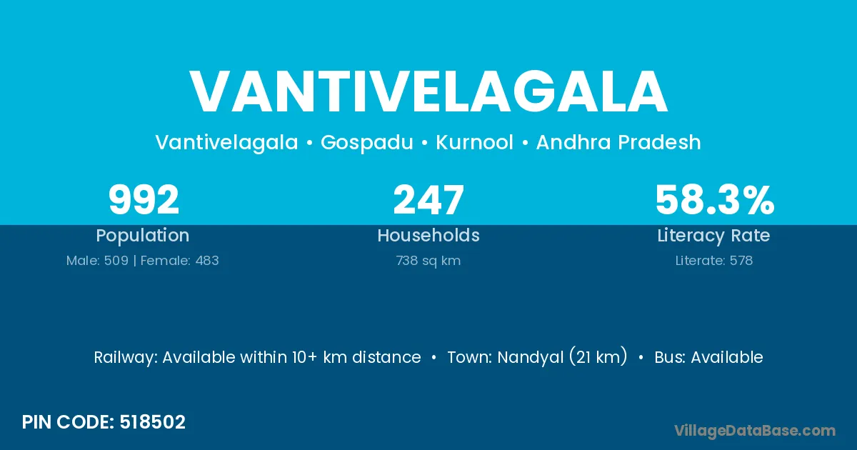 Nandyal (21 km) is the nearest town to Vantivelagala village for major economic activities and is located approximately 21 km away.