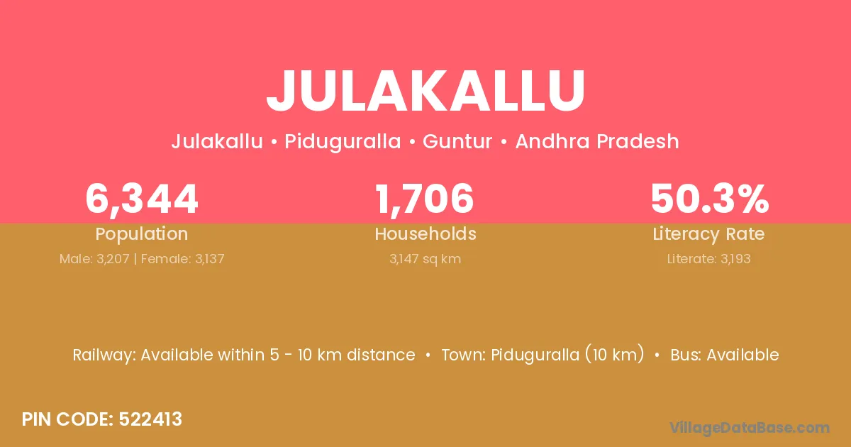 The literacy rate of Julakallu village is 39.93%. Male literacy stands at 49.58% and female literacy at 29.86%.