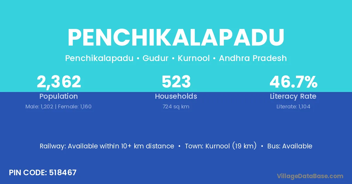 Kurnool (19 km) is the nearest town to Penchikalapadu village for major economic activities and is located approximately 19 km away.