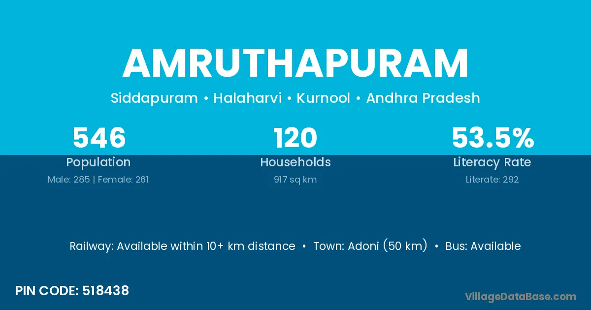 Adoni (50 km) is the nearest town to Amruthapuram village for major economic activities and is located approximately 50 km away.