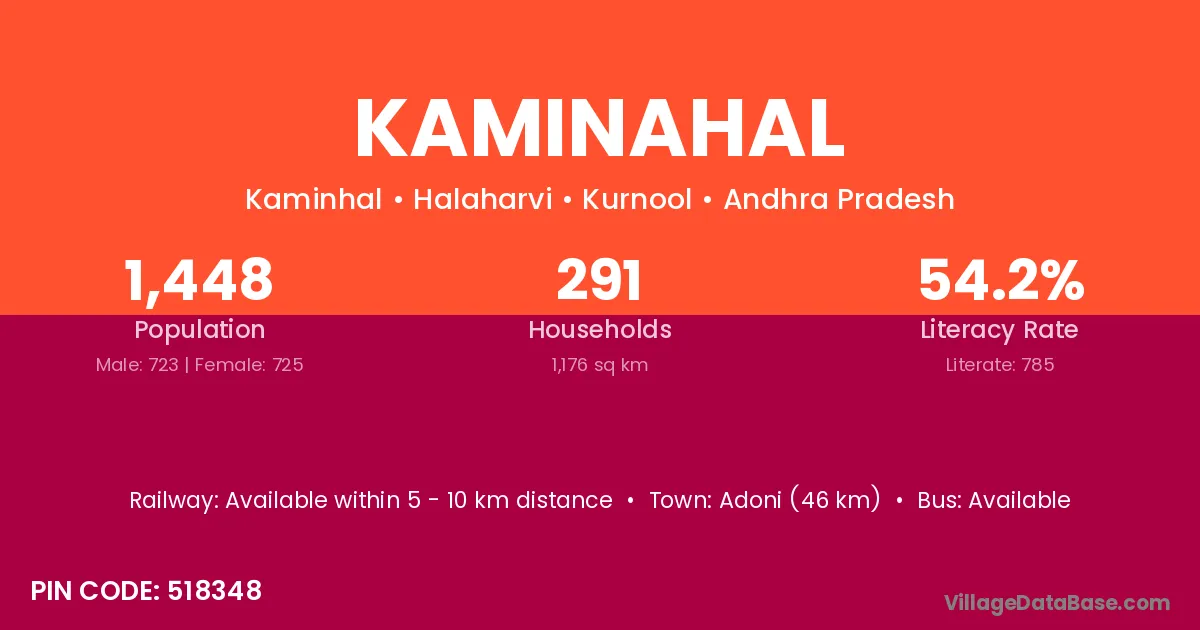 Adoni (46 km) is the nearest town to Kaminahal village for major economic activities and is located approximately 46 km away.