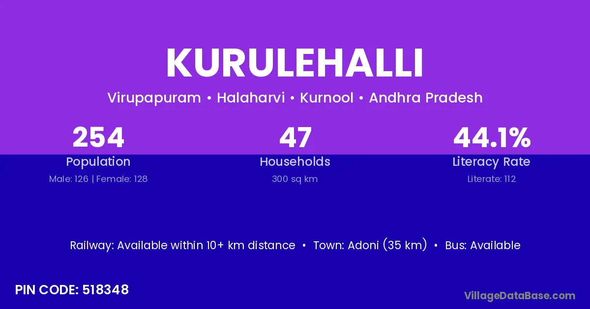 Adoni (35 km) is the nearest town to Kurulehalli village for major economic activities and is located approximately 35 km away.