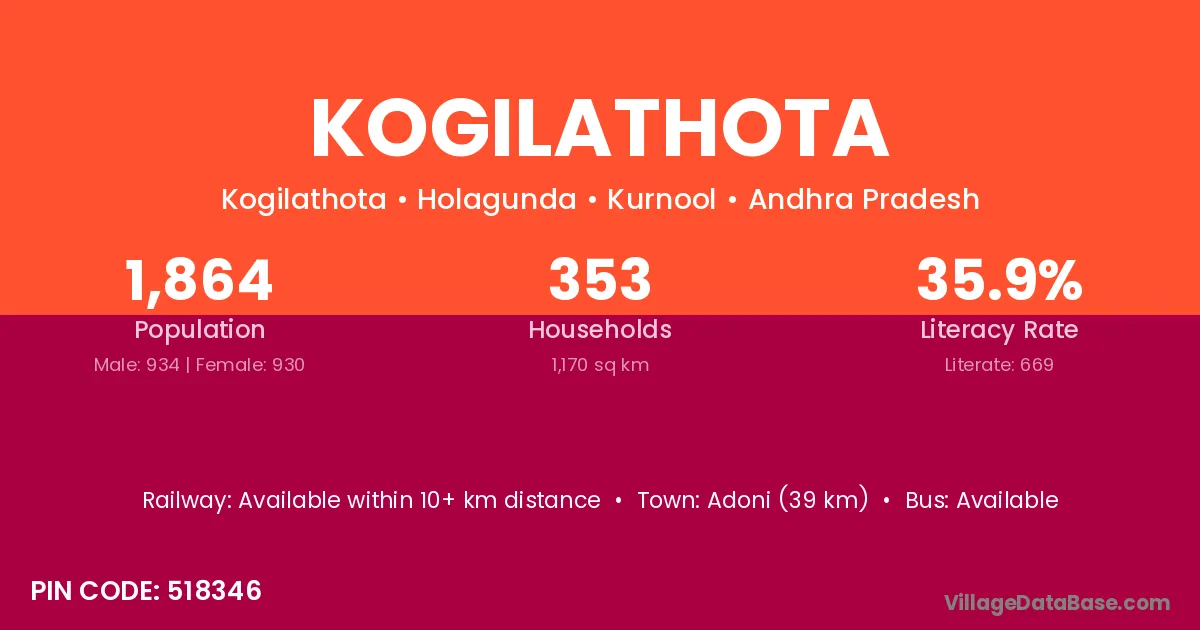 Adoni (39 km) is the nearest town to Kogilathota village for major economic activities and is located approximately 39 km away.