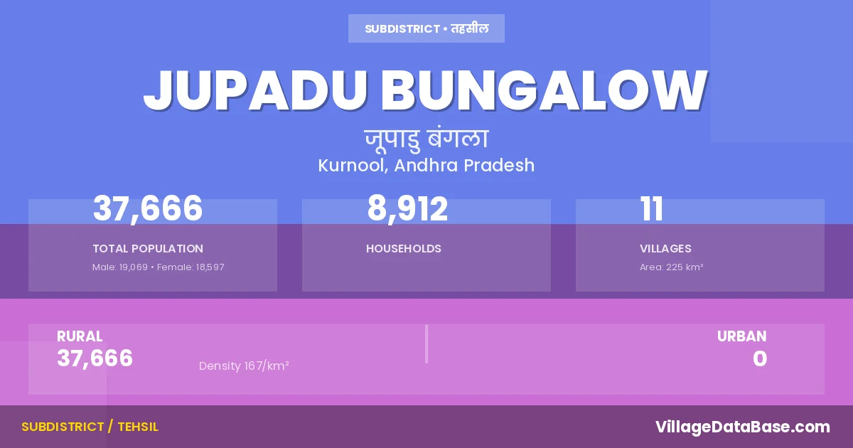 According to the 2011 census The total area of Jupadu Bungalow Mandal is 225 km², with a population of 37666 people. The population density is 167 inhabitants per square kilometre, and there are approximately 8912 houses in the sub district.