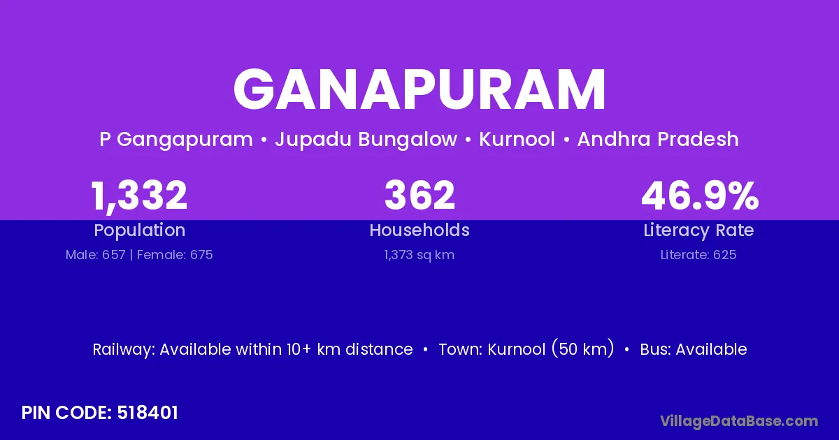 Kurnool (50 km) is the nearest town to Ganapuram village for major economic activities and is located approximately 50 km away.
